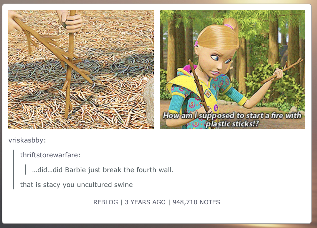 In 2013, deep in the throes of my Tumblr obsession, I came across this post on my dashboard. It’s a gifset, in which Barbie’s little sister Stacie, who is trying to earn her Girl Scouts camping badge, attempts to start a fire by rubbing two twigs together. She groans in frustration, then complains, “How am I supposed to make a fire with plastic sticks?"