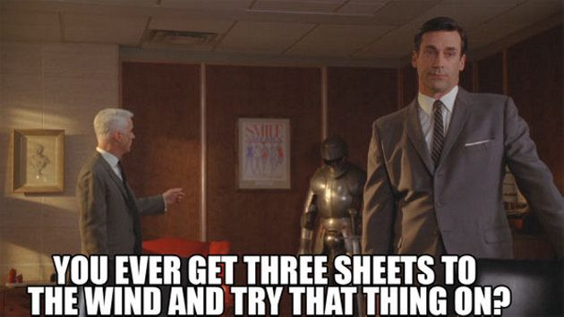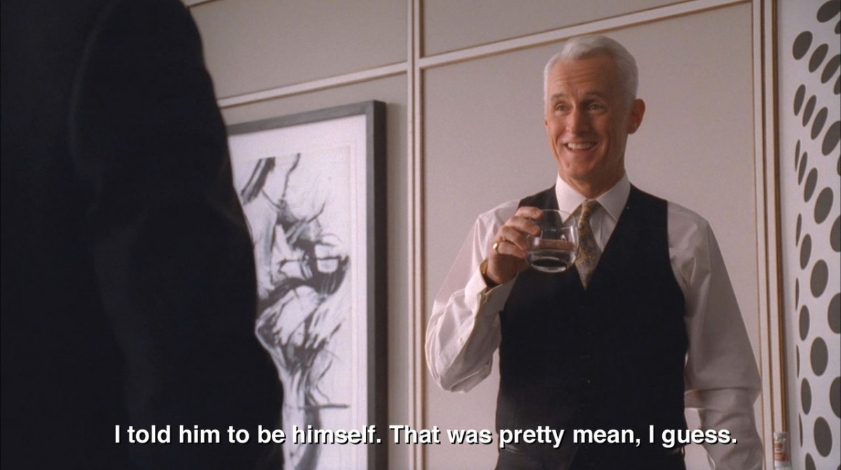 The most brutal scenes on Mad Men, of which there are perhaps a few too many, are always punctuated with Sterling’s good humor and one-liners. Do you remember the scene where Kinsey’s secretary runs over the foot of the new CEO of Sterling Cooper with a John Deere lawn mower? I weirdly didn’t remember it either, and when I rewatched that episode recently, I was horrified. What the hell was this? Why was that necessary? What did a gruesome severed foot contribute to the narrative? As office cleaners begin literally squeegee-ing blood from the glass walls of Paul Kinsey’s office, Sterling pops in with a jaunty look on his face. “He might lose his foot,” Kinsey says. Sterling’s response? “Right when he got it in the door.” Would you get a load of this guy! What a scamp.